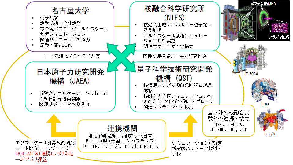 名古屋大学、量子科学技術研究開発機構( QST)、核融合科学研究所( NIFS)、日本原子力研究開発機構( JAEA)が有機的な協力関係をもって課題の推進にあたる。
