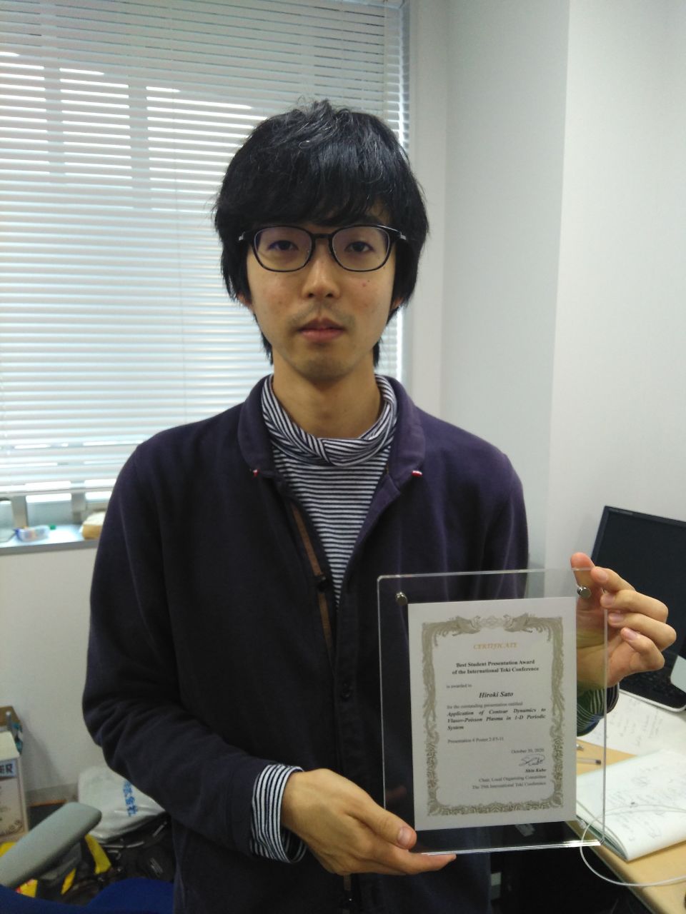 オンラインで開催された国際学会 29th International Toki Conference on Plasma and Fusion Research (ITC29) で、渡邉先生とP研の修士2年の佐藤大樹君が発表を行いました。佐藤君は"Application of Contour Dynamics to Vlasov-Poisson Plasma in 1-D Periodic System"の題で発表を行い、Best Student Presentation Award を受賞しました。おめでとう!